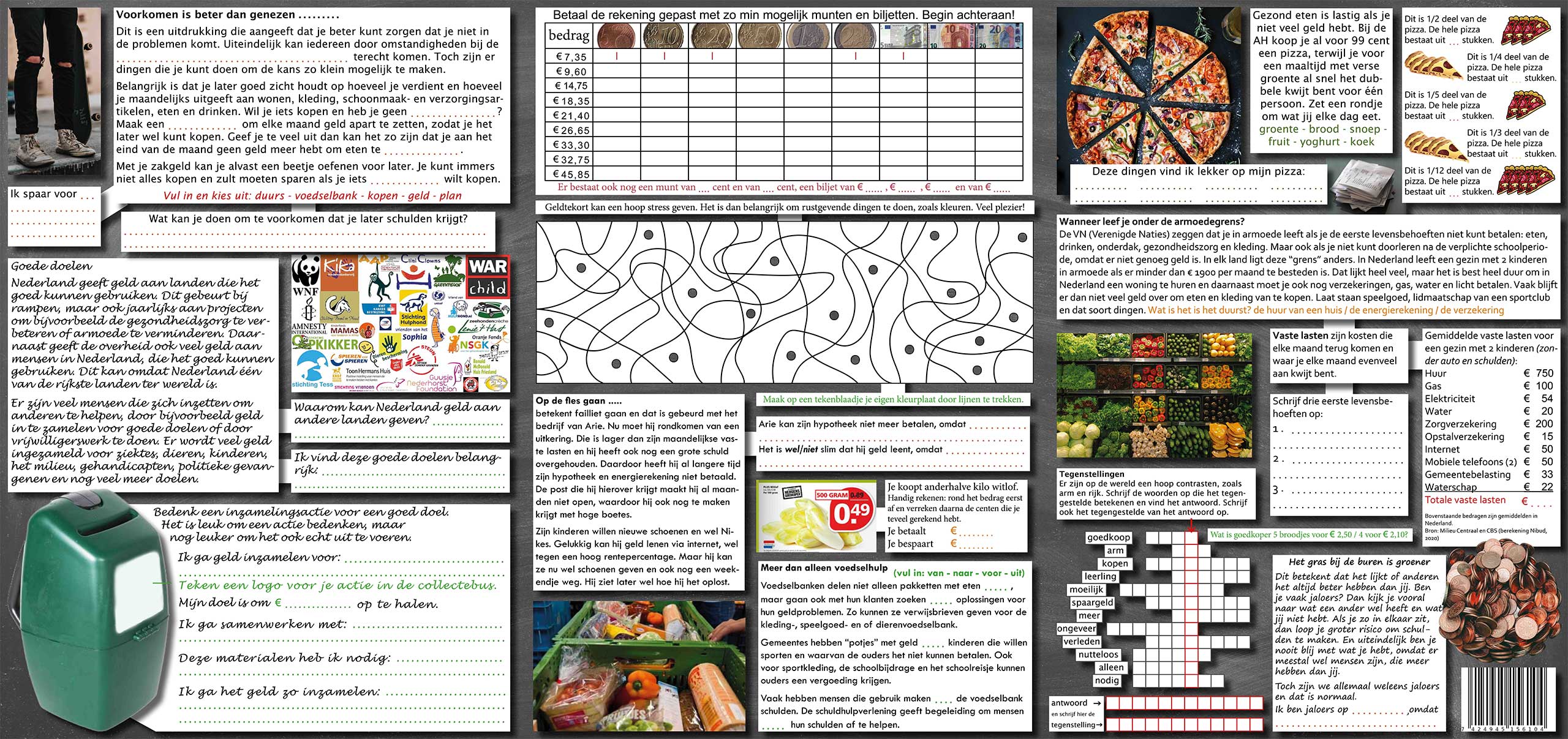 - bestaan uit 6 pagina’s A4 vol met afwisselende opdrachten;