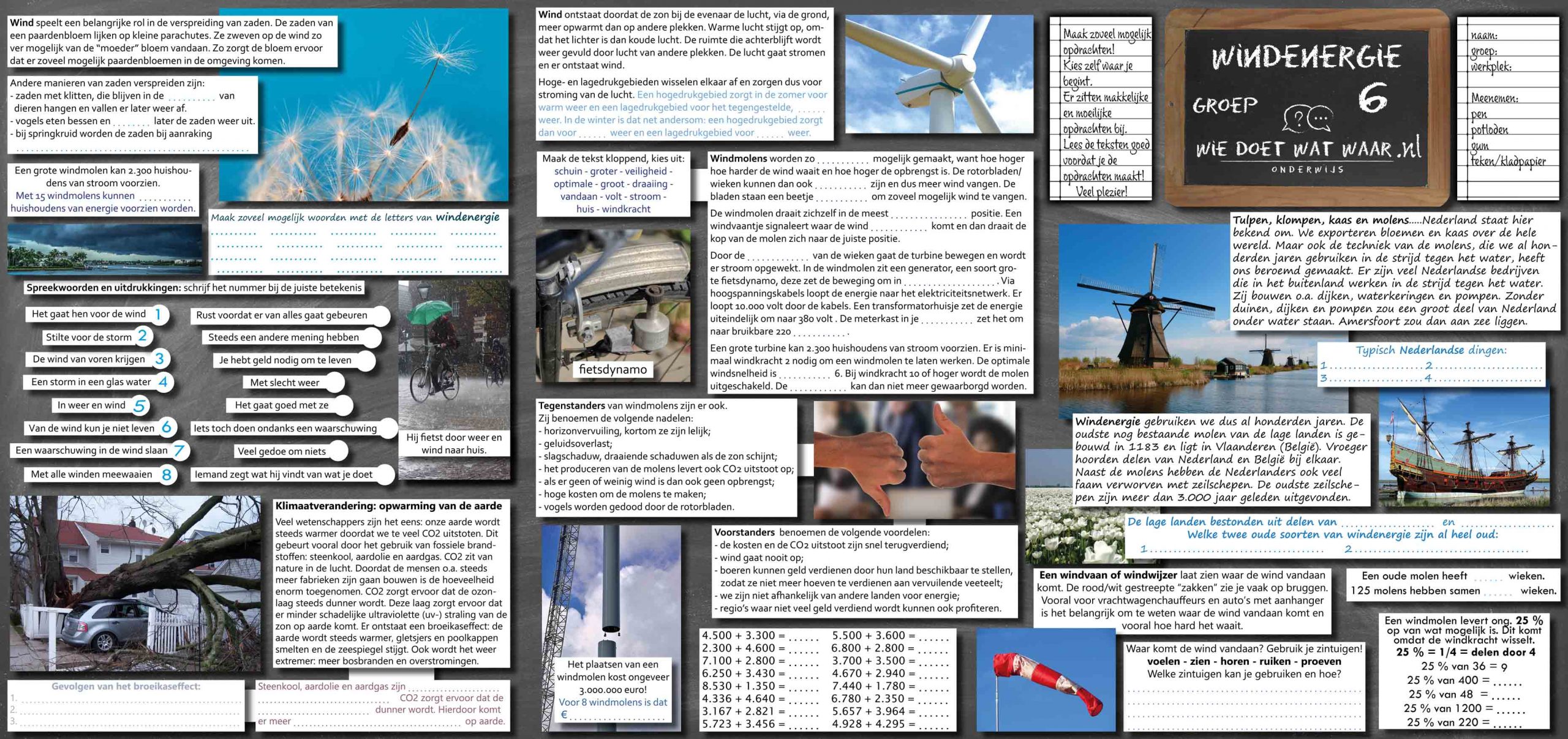 Wat zijn de voor- en wat zijn de nadelen? Waar kan je windmolens bouwen? Welke invloed heeft klimaatverandering? Hoe ontstaat wind? Hoe maken planten gebruik van de wind? Wat betekent windkracht 8? En nog veel meer…..